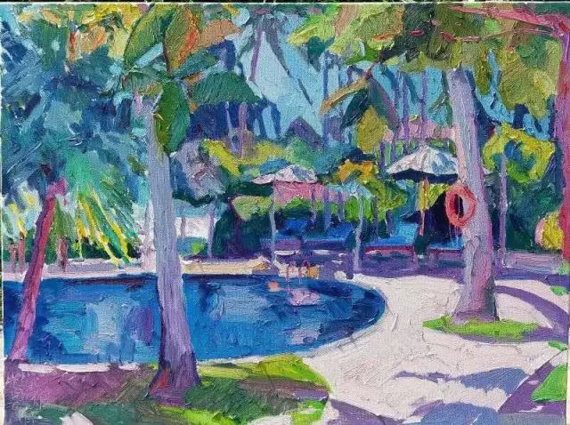 2、夸張的色彩。李生南作品顏色給人們的沖擊力是有目共睹的。他不是用純度很高的顏色作畫,而是把顏色降調(diào)處理,在一定的色度區(qū)域內(nèi),使用補(bǔ)色造成強(qiáng)烈對(duì)比,使畫面感覺色彩斑斕。