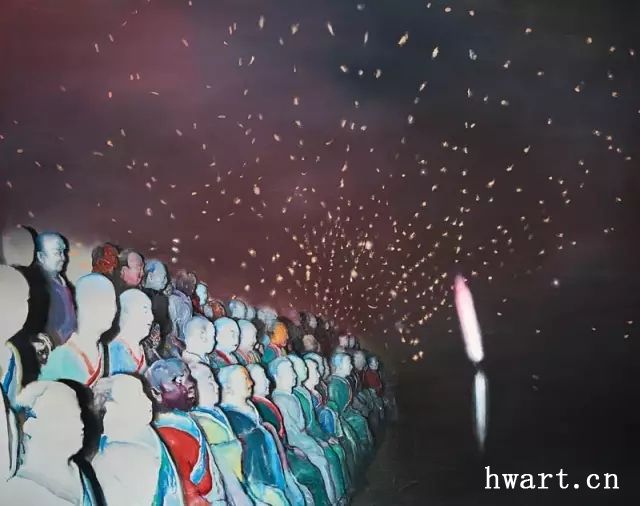 在許東生的繪畫(huà)里,光是至關(guān)重要的元素,它無(wú)處不在。它就在昏暗天幕下的地光里,就在羅漢們熠熠發(fā)光的容貌中,就在神婆風(fēng)旋云舞的流光上,也在克萊因藍(lán)與幽冥的暮光間……從來(lái)都是作為色彩的隱身者而存在的光,被許東生賦予了獨(dú)立和物質(zhì)化的視覺(jué)形式。在他較早的作品里,通體發(fā)光的人體幽靈們,相互擁抱著,攙扶著,燭照著,以此來(lái)驅(qū)趕黑暗的吞噬;而漂浮在煙塵中的不明發(fā)光體,更猶如神明的乍現(xiàn),在提示著和指引著迷失和困頓中的羔羊。