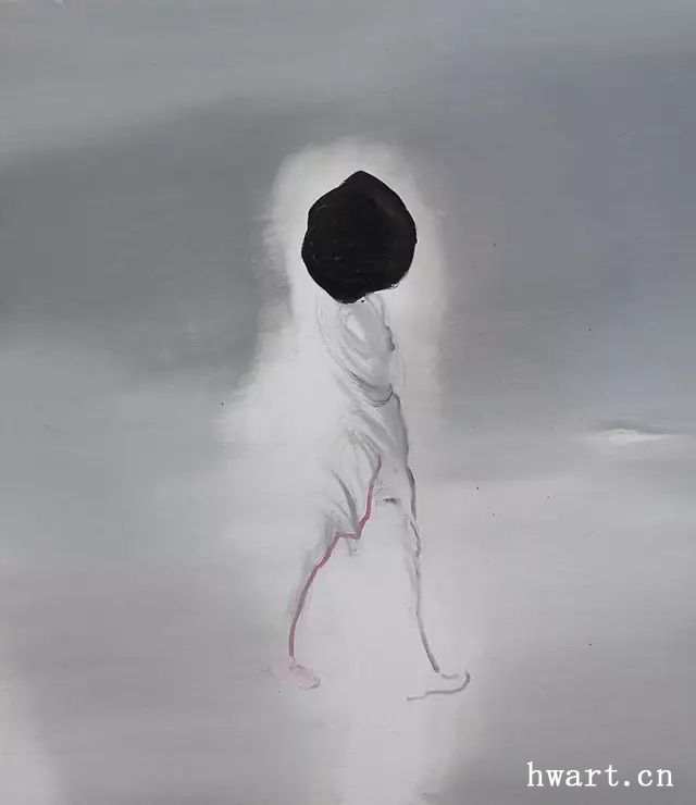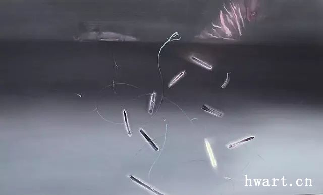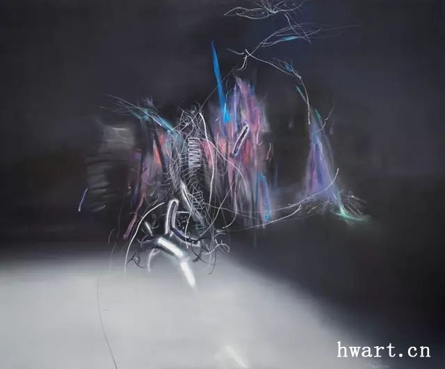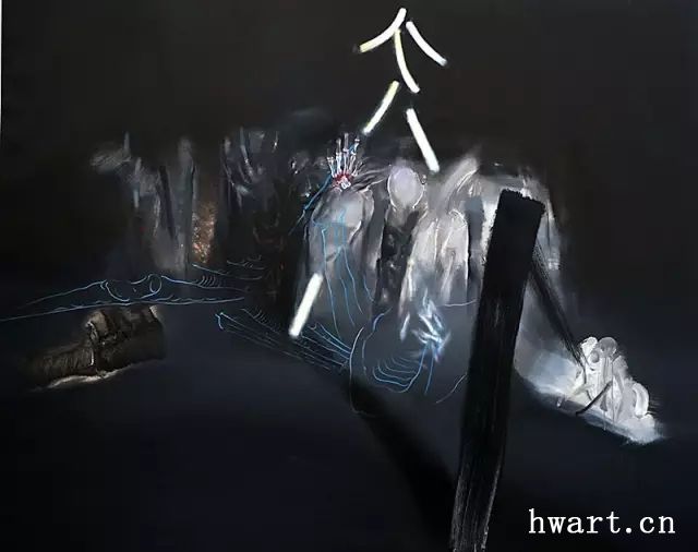 從最初對(duì)行尸走肉般的人體描繪,到人體幽靈的意象性表現(xiàn),再到黑暗與幽冥中光影和游線的提煉,許東生在努力地追尋生命的形而上的終極形式,在空無(wú)寂寥和幽暗深邃的空間中尋找生命難以承受之輕的蛛絲馬跡。然而,視覺(jué)繪畫(huà)終究不是概念化的哲學(xué)玄思,它需要光影,需要色彩,需要明暗的調(diào)子,更需要光影線條的聚合體和形象物,因?yàn)槌粮〉墓庥捌鋵?shí)是由無(wú)數(shù)現(xiàn)實(shí)事與物的生命軌跡交織和積淀而成的。于是,有形無(wú)形的游魂們便浮游出畫(huà)面,時(shí)而如旋風(fēng)舞動(dòng),時(shí)而如光影弄?jiǎng)?,時(shí)而形單影只,時(shí)而森森然列陣而出,畫(huà)面更加豐富,空間益發(fā)多元,乖張的戲劇性蕩漾洋溢。