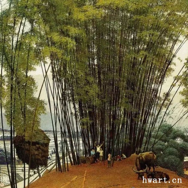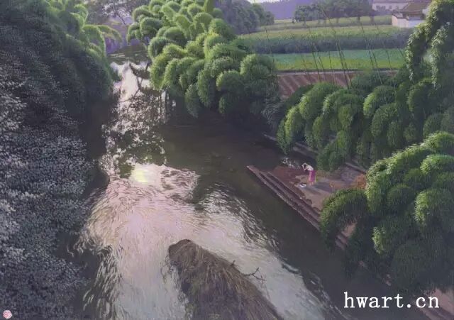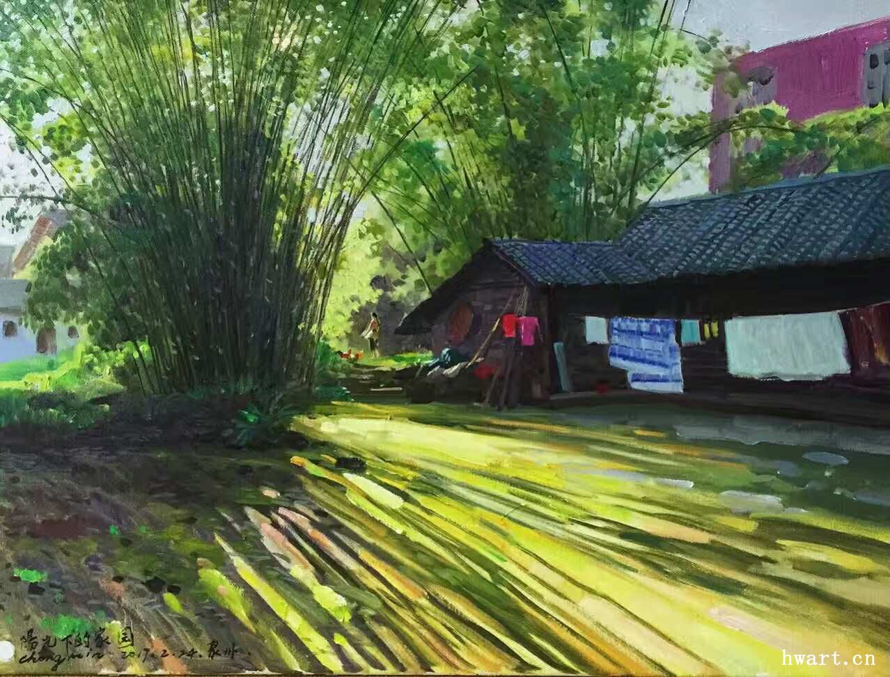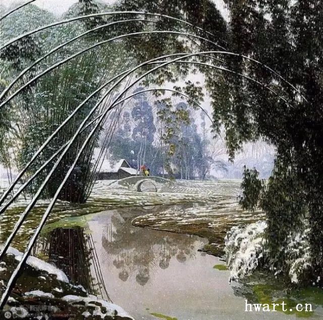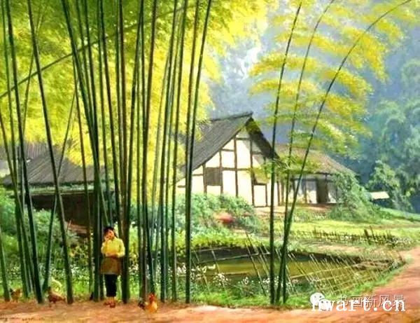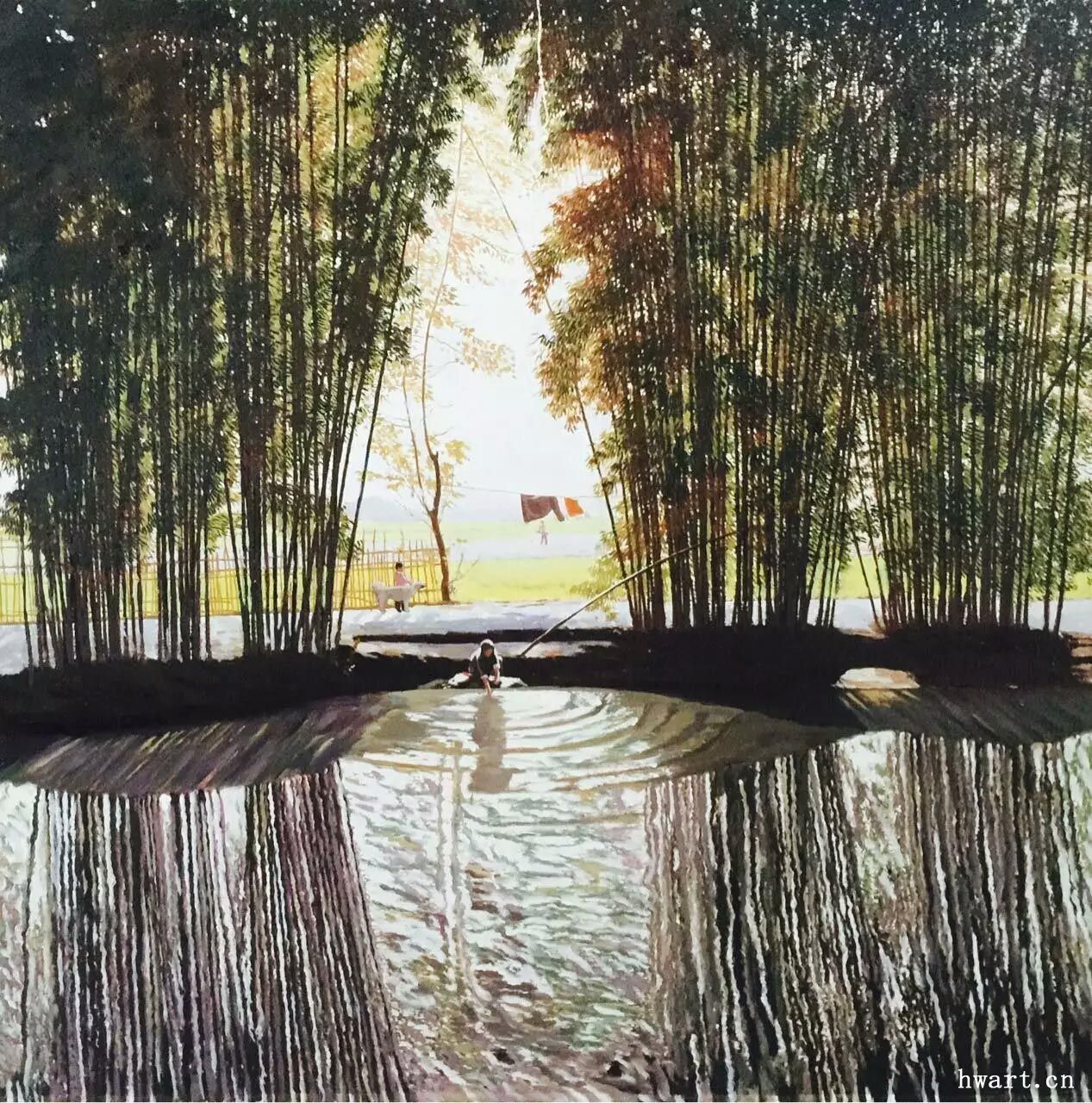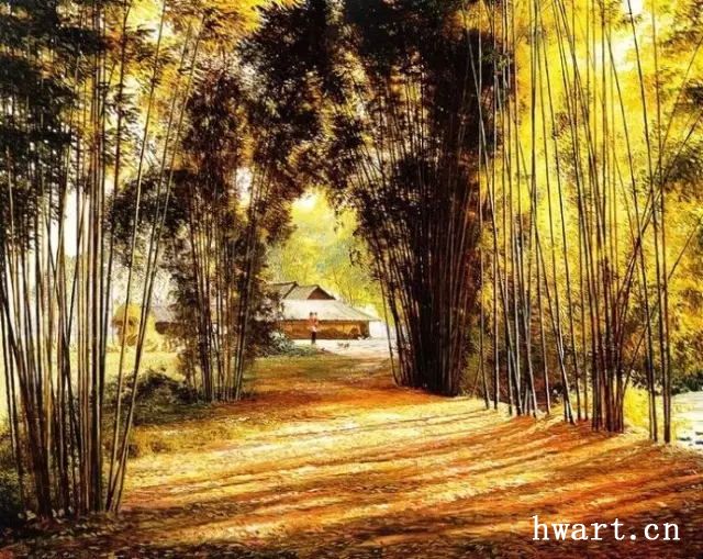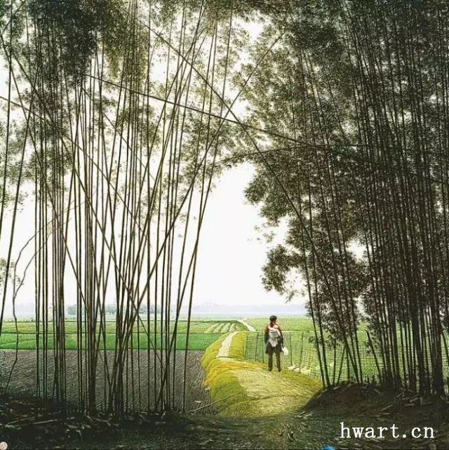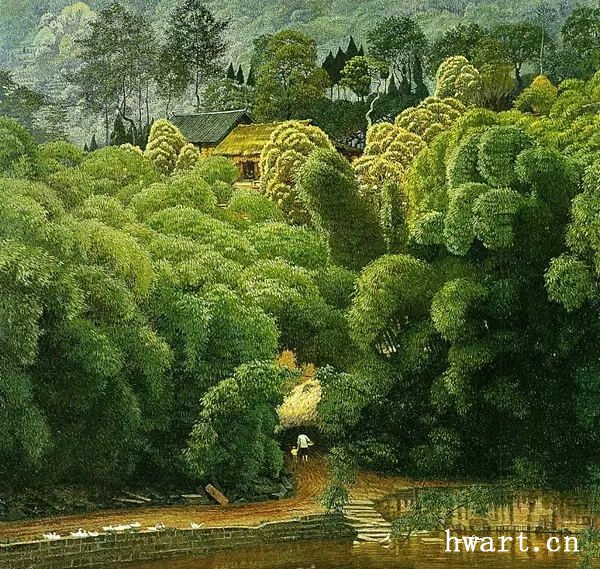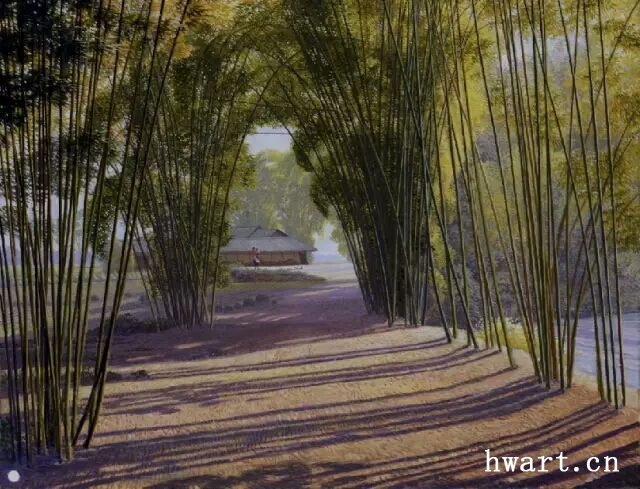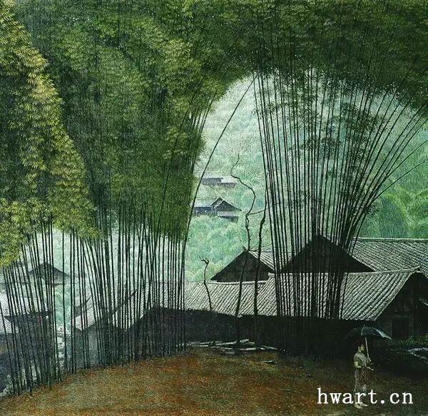 他的寫實(shí)油畫,在唯美清澈的視覺效果下,有著川西平原鄉(xiāng)村原野獨(dú)有的春意空闊煙橫水漫的純凈氣息。畫面滲透出一縷縷撲面而來的清風(fēng),干凈通透,溫暖淡然。簡崇民先生享譽(yù)中外的系列油畫作品《川西抒情詩系列》,洋溢著一個(gè)杰出藝術(shù)家嫻熟高超的藝術(shù)理性思維,筆觸、構(gòu)圖、光影與難以用文字描述的微妙氣息,潛伏著畫家個(gè)體對(duì)自然人文的獨(dú)特認(rèn)知以及對(duì)川西壩子的深情眷戀。既有綠樹春絮、樹底人家的隱匿田園,又有落花猶在、綠蔭深駐、霏霏細(xì)雨的淡淡鄉(xiāng)情與憂傷。因而,畫面中那些柔韌茂密纖細(xì)的翠竹、盤根錯(cuò)節(jié)的老樹、清澈的溪水、蜿蜒的石徑以及枝丫上密集細(xì)碎柔潤的葉片;撐著傘提著竹籃背著娃踩著石板上山的鄉(xiāng)村少婦、竹林中喂雞的鄉(xiāng)村老婦等等,無不在畫家細(xì)膩的筆觸、唯美清澈的線條、優(yōu)雅厚重的色彩中,緩緩綻放出川西壩子鄉(xiāng)村的自然之美與人文精神。