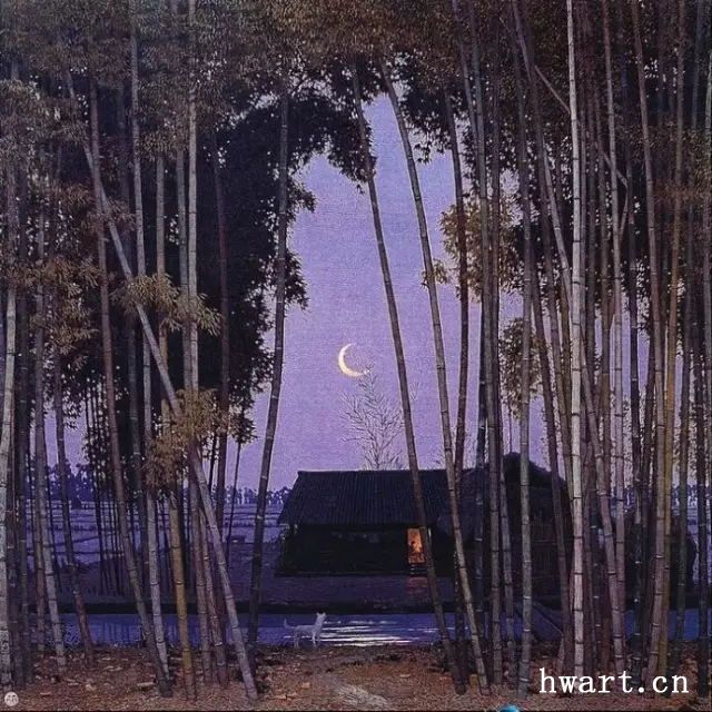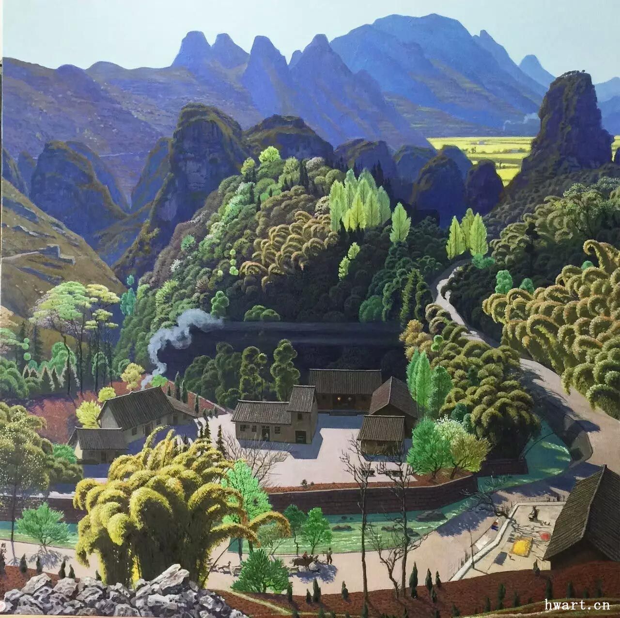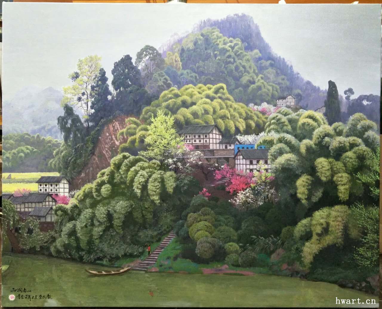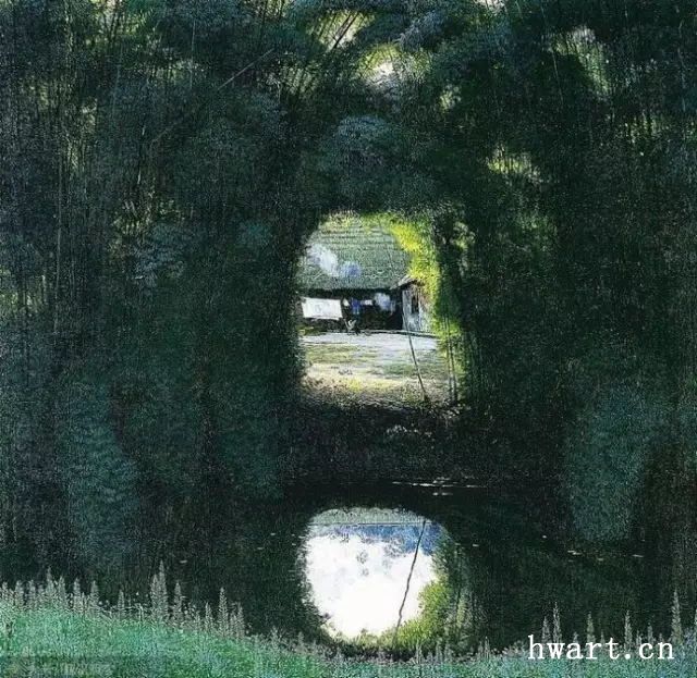 在創(chuàng)作中,藝術(shù)家簡崇民先生的視覺與內(nèi)心是篤定而曠達(dá)的。他冷靜的外表下,其實(shí)蘊(yùn)藏著一顆細(xì)膩柔軟的藝術(shù)靈魂。他如一位遠(yuǎn)遠(yuǎn)站在僻靜之處的觀者,冷靜地觀察定格著眼前的一切,天地萬物鄉(xiāng)野村舍,然后再一聲不響地用自己細(xì)膩準(zhǔn)確的小紅毛畫筆,細(xì)細(xì)密密點(diǎn)點(diǎn)滴滴切入肌膚般地描繪出來;有時(shí)候,他又以凜冽穩(wěn)健的筆觸、精確高超的寫實(shí)手法、清晰入微的線條,于宏觀中切入一個(gè)獨(dú)特的視角,刻畫出一幅幅川西鄉(xiāng)村最唯美的畫面。油畫精品《夏雨溪山圖》《綠幕》《綠色的情思》《冬天的陽光》《蒼山如海》等等堪稱中國油畫藝術(shù)界杰出的作品并先后被美國、香港藏家收藏。其中,作品《綠幕》給我印象極為深刻:一叢竹,一個(gè)洞,一倒影。畫面虛實(shí)結(jié)合,竹幕農(nóng)舍、雞鳴犬吠間,折射出畫家所要表現(xiàn)的人類遠(yuǎn)古以來的農(nóng)耕文明和母性的溫暖。據(jù)畫家回憶,三十多年前,他獨(dú)自離開喧囂熱鬧的四川油畫界,行走在川西的田野小路上,尋找心靈的歸屬?;蛟S,這些尋覓連畫家自己都難以言說動(dòng)力源自何處。這段時(shí)期,曾經(jīng)有十五年的時(shí)間,簡崇民先生獨(dú)自騎著破舊的自行車、摩托車穿行于四川成都、都江堰、邛崍、眉山、樂山等地。他感覺川西大地猶如一位溫暖的母親,以自己含情脈脈俊逸蜿蜒的身姿,交錯(cuò)跌宕的阡陌,賦予了自己對(duì)生與死、過去與未來、純粹與復(fù)雜的深刻思考。簡崇民在川西大地的暮靄斜陽、竹林農(nóng)舍、清溪頑石以及木樓青瓦中,逐漸找到了自己精神的歸屬。因而,他創(chuàng)作的大量以川西風(fēng)景為主題的精品油畫,震驚中外,名聞遐邇。其作品《曉霧初開》《晚秋圖》《山高水長》《秋天的敘事詩》《明月初上家園》《夢(mèng)里依稀回故鄉(xiāng)》《夢(mèng)鄉(xiāng)》等等作品,令美術(shù)界、學(xué)術(shù)界以及中外觀眾無不驚嘆其獨(dú)特視覺、細(xì)膩筆觸、肌理韻味以及極致高超的繪畫水平和充滿著東方意蘊(yùn)的特質(zhì)。