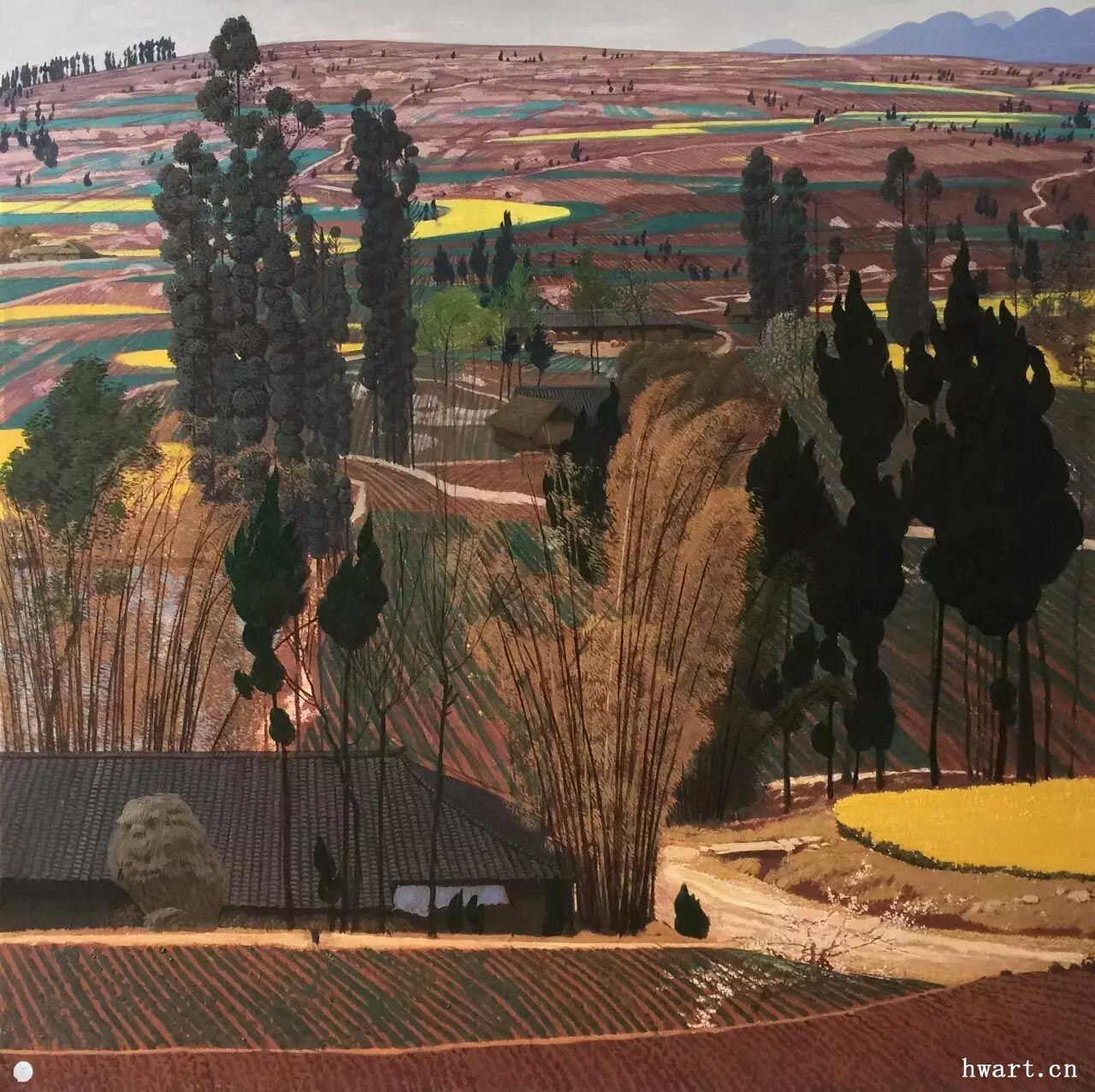 不可否認(rèn),簡崇民先生的《川西抒情詩》系列油畫充滿著耐人尋味、百讀不厭、深邃唯美的詩意意境,透過作品,可以讀到畫家靈魂深處的向往:田園、詩意、簡單、純粹。這讓我想起美國歷史學(xué)家亨德里克對(duì)十五世紀(jì)畫家安琪里柯繪畫作品的感悟:別人早已忘懷的事情他卻銘刻在心。簡崇民用畫筆畫布與油彩告訴我們,他不是靠著想象在畫畫,他畫的每一處,必定是他身臨其境的地方。他在筆觸的控制、色彩的控制、張力的收放中,釋放出畫家本人靈魂深處的某種情結(jié)或者“情緒”。近距離觀察他的精品油畫《浣花溪》:首先凸顯在眼前的是溪水前那一叢茂密青翠的翠竹林,隱約可見竹林掩映下的一隅傾斜草屋屋頂。天色是川西典型的灰蒙,霧氣重重。近處的溪水清晰地倒映著整個(gè)竹林,水面上漂浮著細(xì)微的綠色水草,竹林下隱約可見種植的一洼青菜壟。整幅作品,令人靈魂安靜,或許,這樣遠(yuǎn)離城市的清澈之地,才是我們所向往的心靈家園。油畫精品《安息地》,是我本人最喜歡的油畫作品之一。畫家用極其細(xì)膩凝練的筆觸,描繪出鄉(xiāng)村一望無際的原野。這片莊稼地阡陌交錯(cuò),在悠悠清風(fēng)中充滿著極其強(qiáng)烈的生命力。整幅作品,畫家仍維持一貫的層次深淺不一的大片暗綠色、褐色、藍(lán)色色調(diào),厚重的褐色與暗綠色交錯(cuò),與天空純凈的灰藍(lán)色結(jié)合得天衣無縫。在良田縱橫、寂靜無聲平坦無垠的土地上,突兀地高聳出一叢蘑菇云形狀的竹林,天空綻開一片云彩,投射出一縷強(qiáng)烈的白光,撒在田野中央這唯一的竹林上空。畫面在消退了原有強(qiáng)烈的色彩后,顯示出神秘、飽滿、安靜、夢(mèng)幻而又暗藏著頑強(qiáng)的生命力。畫家或許在用筆觸畫面暗示或者抒發(fā)一種復(fù)雜和純粹的心境。但觀者,比如我,在畫面前,自然可以靜靜領(lǐng)悟到作品所滲透出的是畫家所要傳遞的某些精神訴求。如此安靜廣袤的田園,與竹林里那一抹微弱的燈光,存在與虛無,生命與自然,瞬間與永恒,或許這就是我們靈魂深處最渴求最純粹最簡單的精神安息地。