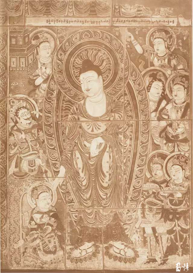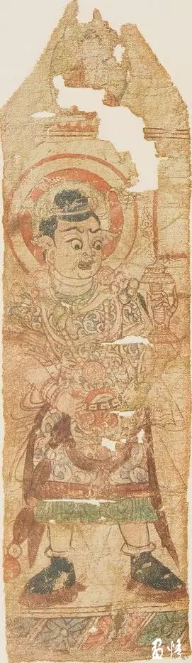 這身明王像三首四臂。手中分別持斧,索,骷髏和金剛杵,站立在一條綠色大魚(yú)的身上。周圍有回鶻文和漢文榜題。明王眼神低垂,左腳抬起,右胯部微向外扭,神性氣質(zhì)濃厚。