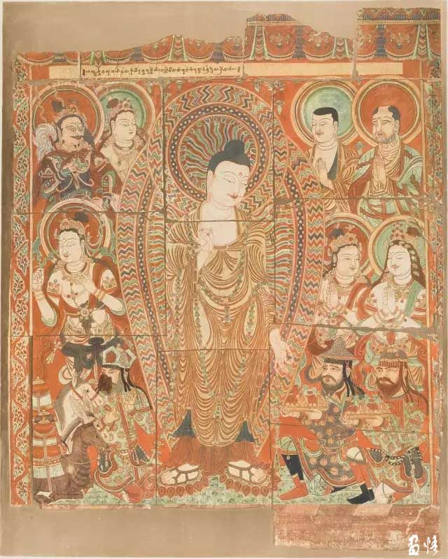 此畫(huà)描繪的是釋迦牟尼佛有一世做大商人時(shí),為了表示對(duì)六世佛的崇拜,他用大象、馬匹、黃金、女人、寶石和珍珠,建造了一座精美的園林,供奉給了六世佛。畫(huà)面中主佛下左右兩供養(yǎng)人被日本人所竊,此圖右下畫(huà)胡帽長(zhǎng)髯二跪姿男供養(yǎng)者,各托盤(pán),以盤(pán)中的七個(gè)袋狀物供奉佛陀。左下部一長(zhǎng)髯者雙膝跪地,后隨一駝一馬,銘文中曰長(zhǎng)者,而壁畫(huà)中表現(xiàn)的卻是佩劍武士。圖版上部及左下略殘。