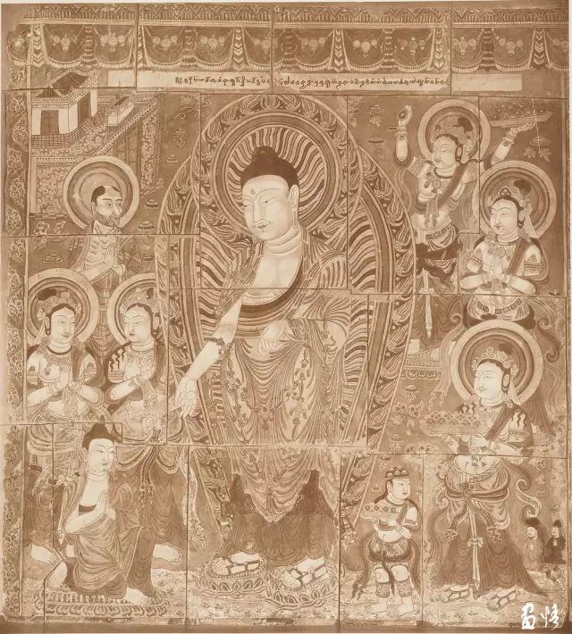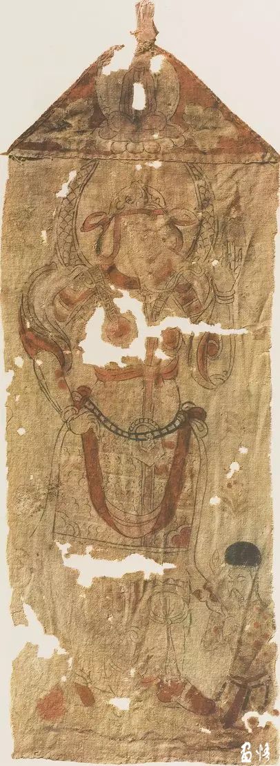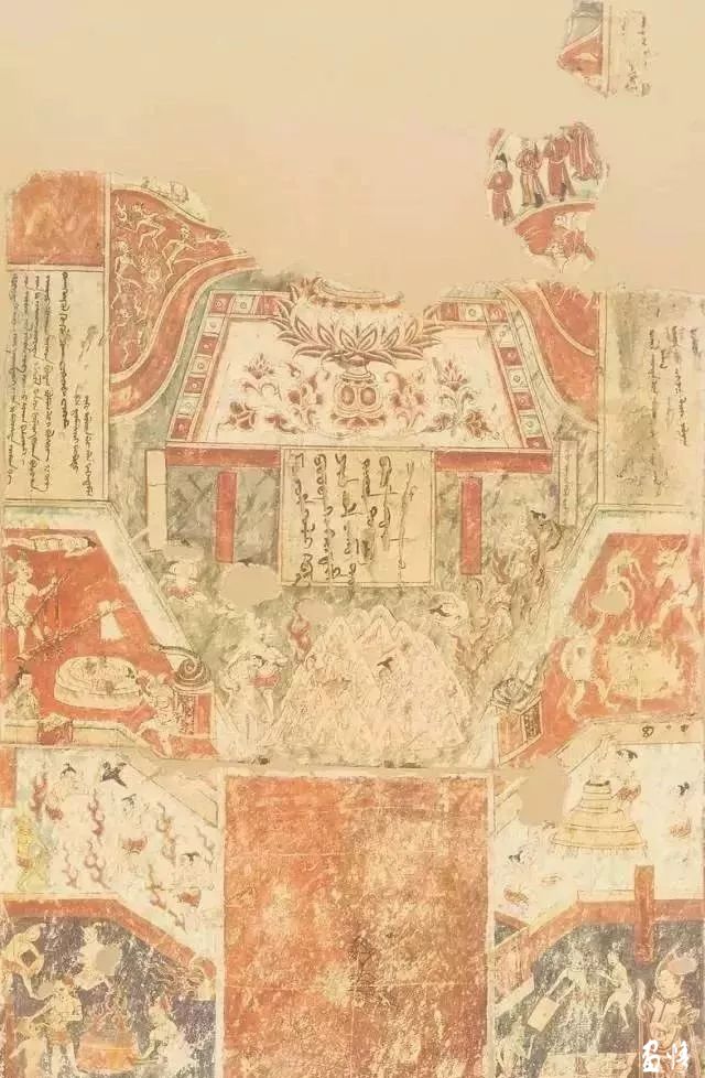 此畫(huà)描繪的是釋迦牟尼佛有一世做國(guó)王時(shí),供奉給佛陀一把鑲嵌寶石的帶柄傘蓋,表示對(duì)無(wú)所不能的獅子人中尊佛陀的崇敬之意。圖中左下角跪菩薩上方者所持之幡,右下二王者式人物所持之傘蓋,即《有部藥事》中的寶幢蓋。左側(cè)下方畫(huà)一跪姿人物,勒柯克認(rèn)為他即是此畫(huà)的供養(yǎng)人--釋迦牟尼佛的前世。