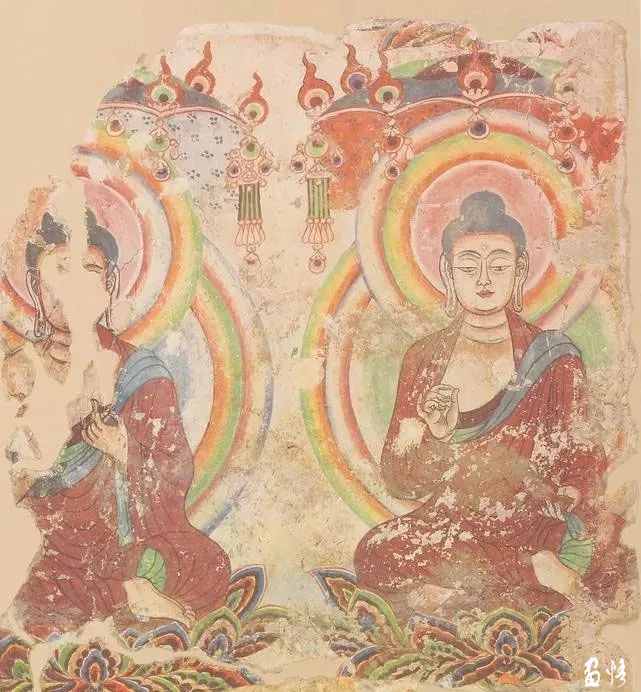 此畫(huà)描繪的是釋迦牟尼佛前生在一座快樂(lè)的城市中做大商人時(shí),建立了許多廟宇精舍來(lái)供養(yǎng)無(wú)上尊貴的尸棄佛。此壁畫(huà)中不見(jiàn)銘文中提起的大商主或長(zhǎng)者式人物。