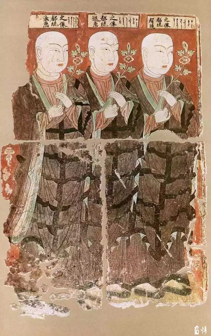 這幅畫(huà)位于20窟左甬道內(nèi)壁。上方有漢文和回鶻文榜提“智通,進(jìn)慧,法慧三都統(tǒng)供養(yǎng)像”,表明這三位僧人均是管理僧眾事物的僧官。畫(huà)面中的三位僧人穿交領(lǐng)廣袖的中原式袈裟,雙手持花供養(yǎng)。人物面目具有中原人特征。