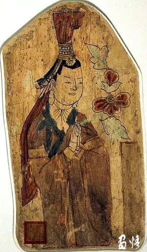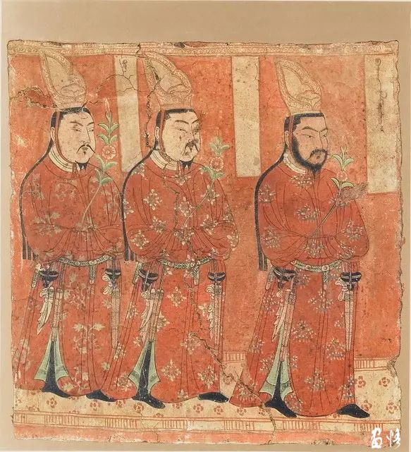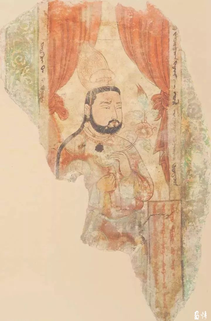 供養(yǎng)人面部方圓,頭頂束冠,腦后垂發(fā),一臉絡(luò)腮胡,樣貌穩(wěn)重而堅(jiān)毅。一手持花供養(yǎng),周圍還有紅色的樓閣和簾幕作為背景。