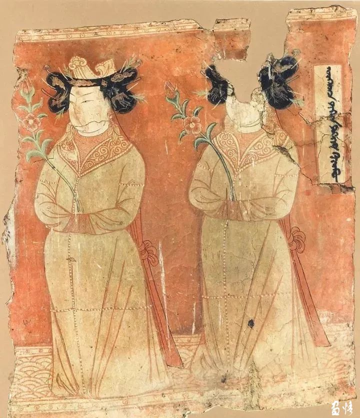 在她們的腦后垂有一條長(zhǎng)長(zhǎng)的紅色絹繩,幾乎垂地,很有特點(diǎn)。畫(huà)面右上方有回鶻文榜題“此是高貴的王后之像”。