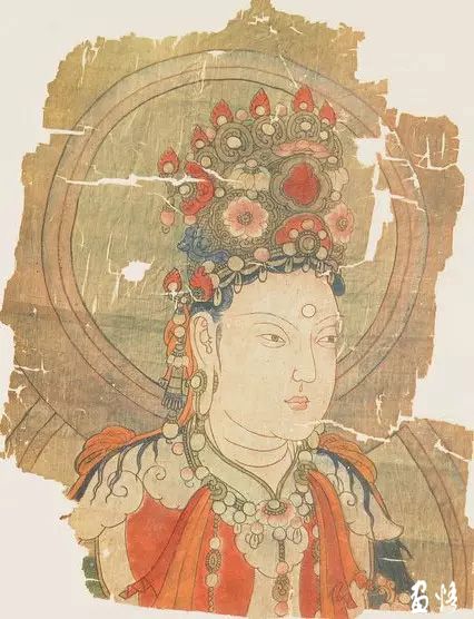 這幅高昌王后供養(yǎng)像位于20窟主室前壁。王后身穿茜色窄袖通裾襦裙,領(lǐng)口刺繡卷草紋。兩鬢盤(pán)起,頭頂戴船形冠,發(fā)髻上插滿釵環(huán),兩耳還各戴一只垂肩的金耳環(huán)。