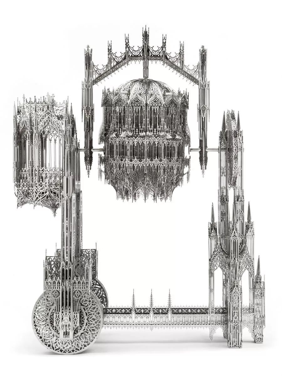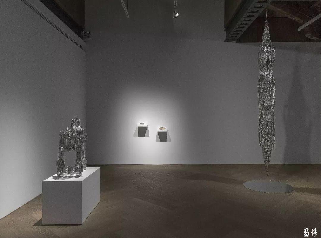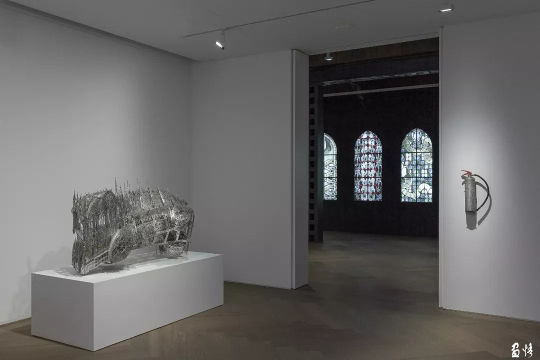 一走進(jìn)展廳,則是德爾維的激光切雕裝置《扭轉(zhuǎn)自傾貨車(順時針)》和一只很容易被人當(dāng)成普通滅火器而無視的鋁制壓花滅火器。“扭轉(zhuǎn)切雕”系列是德爾維擅長的“混種”藝術(shù)語言:將傳統(tǒng)的哥特式建筑與混凝土攪拌機(jī)等工業(yè)元素混搭,扭轉(zhuǎn)的軌跡似乎又遵循了“天擇”的鸚鵡螺等波浪自然元素,其實都是經(jīng)過精準(zhǔn)的數(shù)學(xué)計算和靜謐的現(xiàn)代電腦技術(shù)應(yīng)用而成的。整件作品看起來很荒誕,然而過程又是那么嚴(yán)謹(jǐn)認(rèn)真,這就是德爾維管慣用的反諷手法——而很多時候,我們一場努力、心血和認(rèn)真,換來的或許只是一場無意義和一場荒誕,這就是生活很大一部分的真相。據(jù)悉,另一件同系列切雕裝置《栓》(Suppo),原型是2012年盧浮宮個展期間矗立于玻璃金字塔內(nèi)的巨型切雕裝置,我們看到的是縮小版。