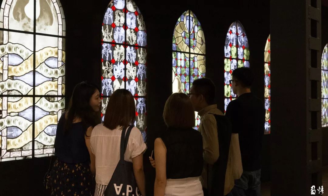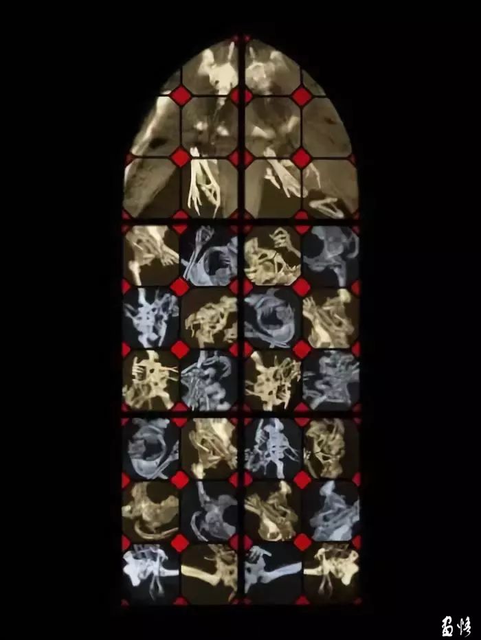 同樣爭議性的還有教堂彩繪玻璃系列,在展廳現(xiàn)場遠(yuǎn)看三片彩繪玻璃聯(lián)排的時候,能感覺到的和我們在教堂現(xiàn)場感受到的一樣精美安謐,但是當(dāng)我們走近細(xì)館卻令人大吃一驚——所謂窗花圖案原來是人體X光片和濁穢的圖像,和宗教的圣潔純美完全是背道而馳。德爾維的這一舉動當(dāng)然是“大膽”的,但正如善于言辭的藝術(shù)家本人所說:他無所畏懼,只是希望尋求肉體和靈魂之間平衡的連結(jié)。