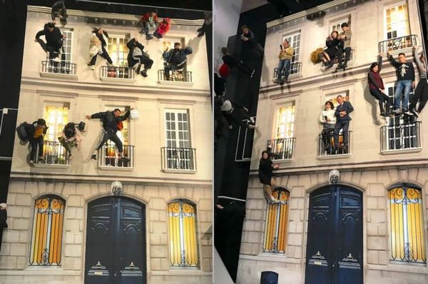 在《林德羅·厄利什:看見(jiàn)與相信》展覽中,體量最大的裝置作品是《建筑》(building)。在這里,觀眾們可以說(shuō)是徹底“放飛了自己”:參觀者無(wú)論男女老少,都自發(fā)性地以各種扭曲的姿勢(shì)躺在了作品上,然后對(duì)著斜向45度角的鏡子凹出造型,拍下自己掛在建筑外墻上的假象。而圍在這件作品前排隊(duì)的人們,看著以各種猙獰的姿勢(shì)躺在“墻”上的人,臉上大概都是“嗯,我肯定不會(huì)這么做作啦”這樣的表情;然而,一旦當(dāng)自己真正躺上去的時(shí)候,也會(huì)情不自禁地根據(jù)作品中窗戶以及欄桿的位置,認(rèn)真地調(diào)整自己的造型,好讓鏡子中的自己看起來(lái)更加真實(shí)的“掛”在墻上,然后不停地按下手中的快門,讓現(xiàn)實(shí)中的不真實(shí)更加接近于鏡子中的真實(shí)。