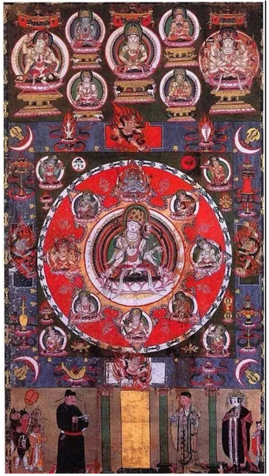 此圖為十分稀有的密十世紀(jì)繪畫,全圖分為上中下三段,上、中段屬于金剛界曼荼羅圖。