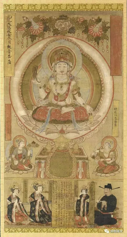 觀音下部中間為供養(yǎng)發(fā)愿文,右為水月觀音像,左為女供養(yǎng)人畫像。整幅畫面構(gòu)圖巧妙,主題突出,層次分明,對(duì)稱均衡,人物生動(dòng),色彩鮮麗,雖然歷經(jīng)千余年,如同新畫一樣。絹畫真實(shí)地描繪了觀音菩薩的莊嚴(yán)妙相、慈悲儀容。