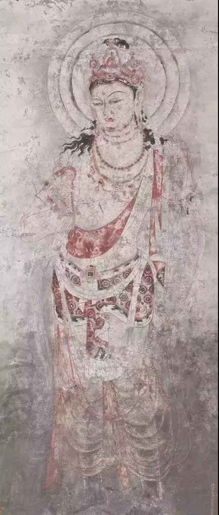 畫面中春蠶吐絲般緊勁鐵線所表現(xiàn)出的高超造型技巧令人嘆為觀止:菩薩那華腴豐滿的肌體、婀娜多姿的體態(tài)、爛漫如花的手姿、當(dāng)風(fēng)飄舉的吳帶、玲瓏剔透的頭光以及濃淡相宜的敷色,皆令觀者目炫神迷。