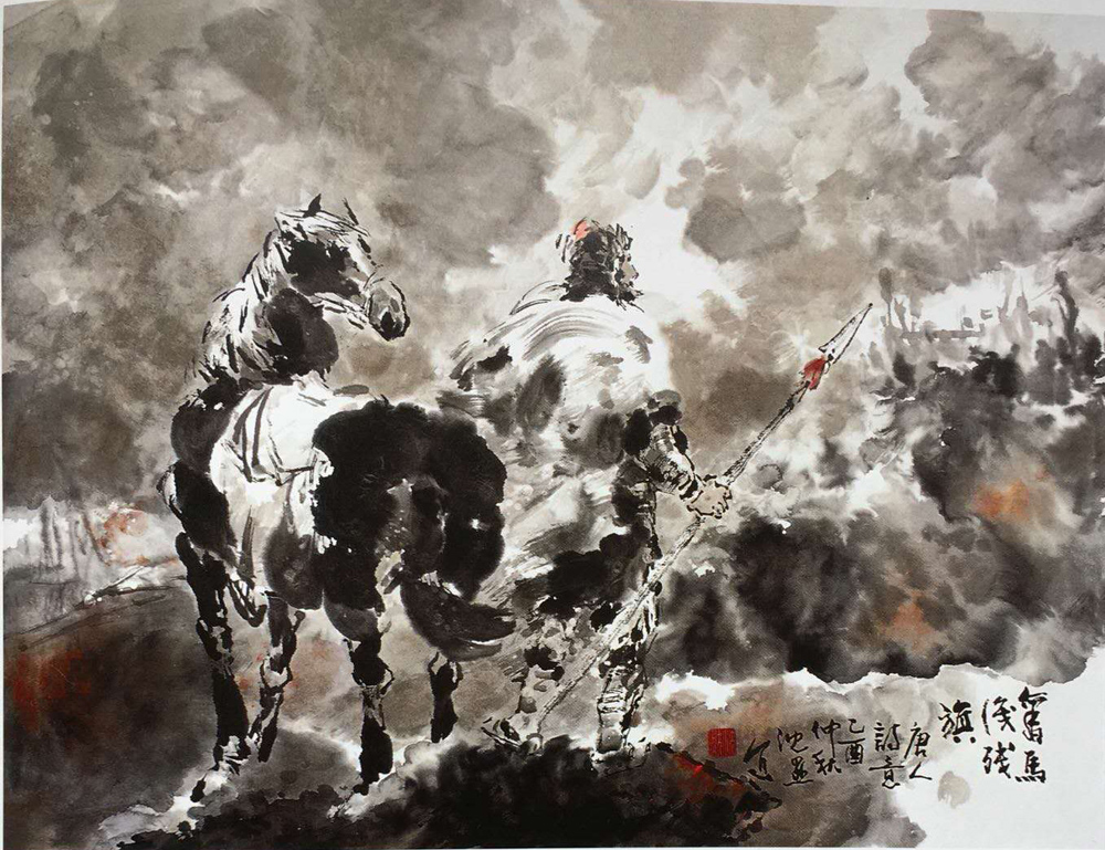 翻飛的鴿群,繽紛的鮮花,甚至右前方的華燈都不是固有的實(shí)景?;蛘呒脑嫾业淖鸪?,或?yàn)闃?gòu)畫所需,或者用于色彩的對比。盡管著筆細(xì)膩,生意盎然,但欣賞者的目光還是被雄偉、堅(jiān)實(shí)、厚重、有立體感、具金屬硬度的雕塑所吸引。那高聳的乳胸,渾圓的臂肌,緊握尖刀的手,甚至臉上繃緊的肌肉,吶喊的口形,翻捲的旗幟,每一筆都蘊(yùn)含著憤怒和力量,閃耀生命的光華。就連獅子頭部奮張的鬣毛,也有肌理可尋。筆的力度、線的規(guī)范、色的重輕以及光暗、結(jié)構(gòu),都處于高度和諧之中,而銅像背后的柱子更隱隱透露出大理石的晶瑩、溫潤。以宣紙、水墨、少量的色為物質(zhì)材料,以毛筆為唯一工具,以國畫技法為本,追求青銅的可觸感,這才是畫家的著力處,是畫家的得意之筆 。