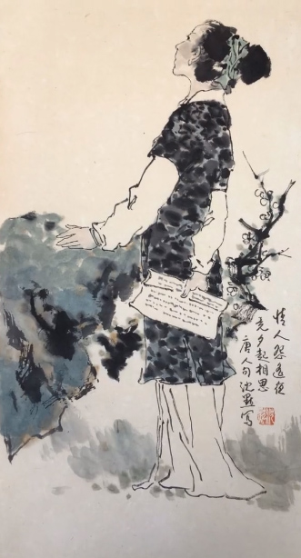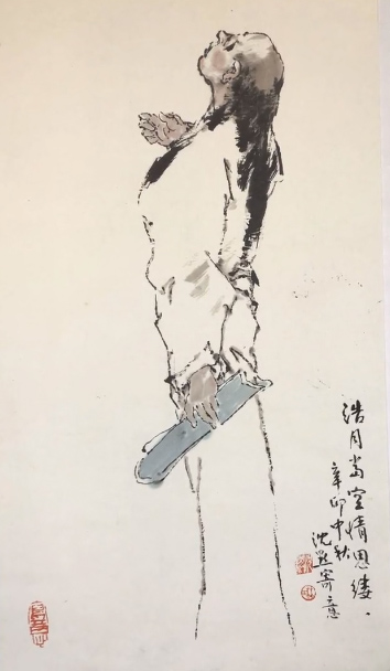 就傳統(tǒng)而言,中國古代的人物畫,由色彩美麗的精工描繪到水墨線條的勾勒以至于墨色氤氳,元?dú)饬芾?,也?jīng)歷了由色入墨的過程。沈默是一位有深厚修養(yǎng)的畫家,他在這兩幅新作中所做的嘗試完全符合中國人物畫的發(fā)展軌跡。而其用筆用墨用色,講究蘊(yùn)藉、渾厚、和諧,迴避大面積的渲染,不采用隨心所欲的潑墨,別有一種大巧若拙的韻味,彌足珍貴。