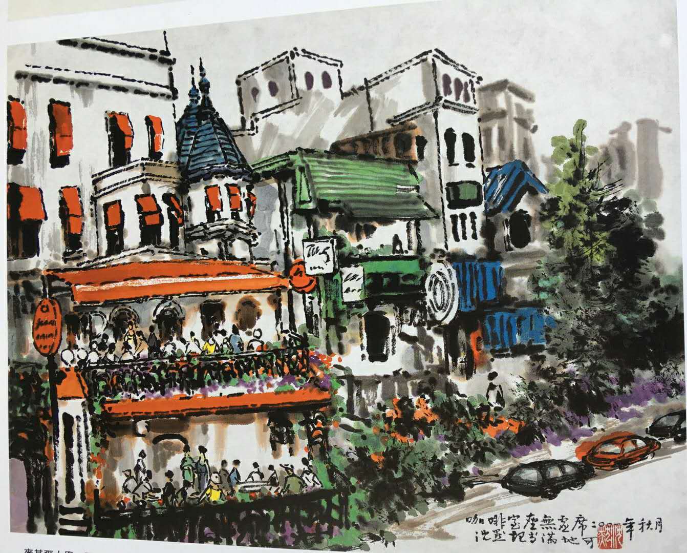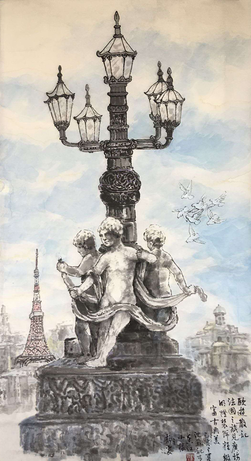 另一副巴黎街頭所見,則運(yùn)用了明顯的立體透視,將景深盡量拉長,巍然挺立的巴黎鐵塔反倒成了小小的陪襯。這樣,此件街頭常見的雕塑不再是孤立的存在,他彷若時光隧道的一個站臺,占據(jù)了歷史和現(xiàn)實(shí)的廣闊空間;那幾盞頗具古典格調(diào)的風(fēng)燈用或濃或淡、或粗或細(xì)的墨線勾出,參差錯落,華燈隱曜,顯示了上乘的中國畫的筆墨功夫。