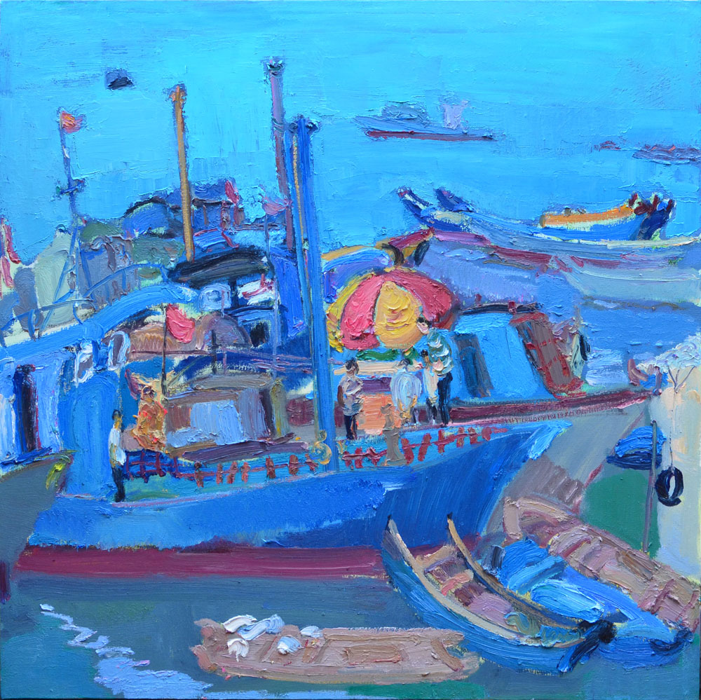 油畫作品《熱風(fēng)笑語繞船飛 》(100*100cm)2015年入選2015吳冠中藝術(shù)館全國油畫作品展。(中國美術(shù)家協(xié)會主辦)