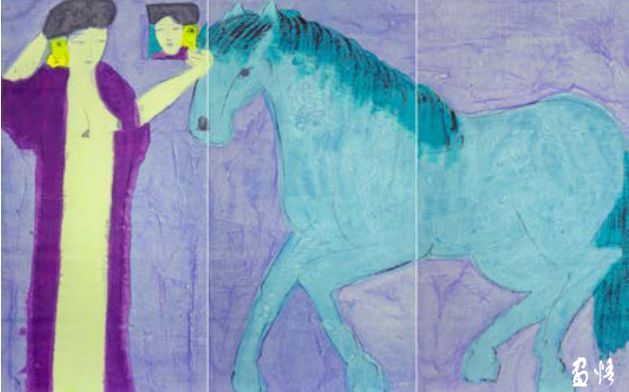 丁雄泉 《紫衣攬鏡少女與藍(lán)馬》182×97cm×3 紙本彩墨、丙烯