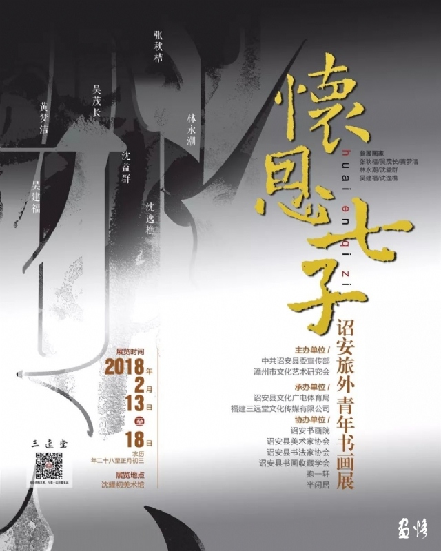詔安乃書畫之鄉(xiāng),自古詩文書畫昌熾,代有傳承,“詔安畫派”作為地方畫派,引領(lǐng)風(fēng)騷百余年 。遠(yuǎn)有謝琯樵、沈古松、馬兆麟,近有沈耀初、沈福文、沈柔堅等。而今,此文脈依舊香火不斷,傳承有序,人才輩出。我常說:有歷史的通道,藝術(shù)就不會飄浮;有時代的氣息,則知道你站在哪里?!皯讯髌咦印笔堑ぴt文脈基因哺育出的優(yōu)秀后學(xué)群體,他們吮家鄉(xiāng)文脈的母乳而長,相信他們亦能為家鄉(xiāng)的文脈之河注入涓涓不斷之細(xì)流。愿“懷恩七子”共同攜手,懷一顆虔誠的文心,“以日習(xí)則學(xué)不忘,自勉則身不墮”為心念,寄意筆墨,放懷時代,脫跡塵紛以懷遠(yuǎn),共同為我們幸福偉大的時代書寫,共同為中華民族鑄就文化自信譜新曲奏強音。