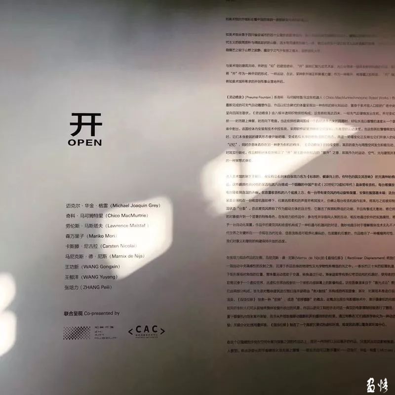 “開”展開幕論壇開始,由知美術(shù)館藝術(shù)總監(jiān)王從卉主持,嘉賓為張尕,王功新,王郁洋,張培力,奇科·馬可姆特里(Chico MacMurtrie),馬尼克斯·德·尼斯(Marnix de Nijs),文森特·馬斯塔夫(Vincent Malstaf)。論壇以“開與未來”為主題,在座嘉賓討論了未來藝術(shù)的可能性,以及知美術(shù)館的發(fā)展方向。