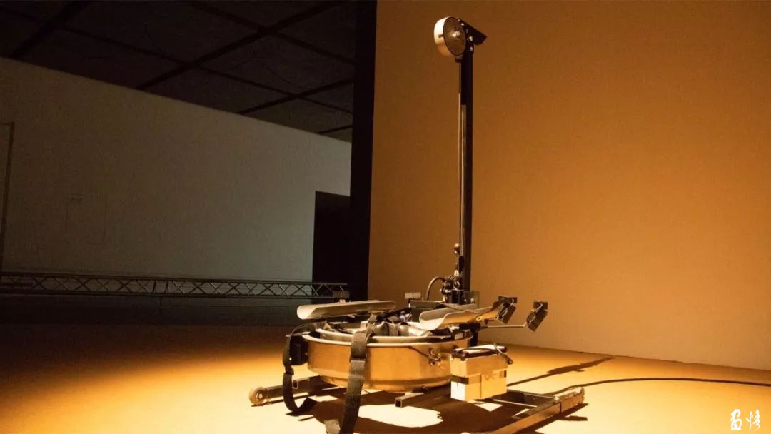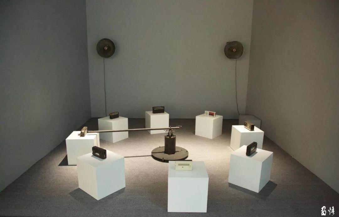 在負一樓的入口處,是張培力的作品《標準的,健康向上的,有特色的圓及其音響》,這件作品用八臺中國老式收音機,排成一個圓圈,播放著不同國家語言的廣播。收音機中間的麥克風,隨機在其中一臺收音機前面停下,將其聲音放大,麥克風和收音機構(gòu)成了一種機器與機器間的對話。