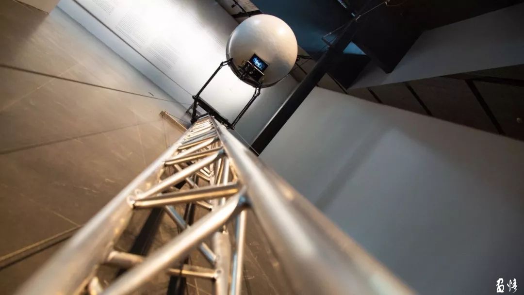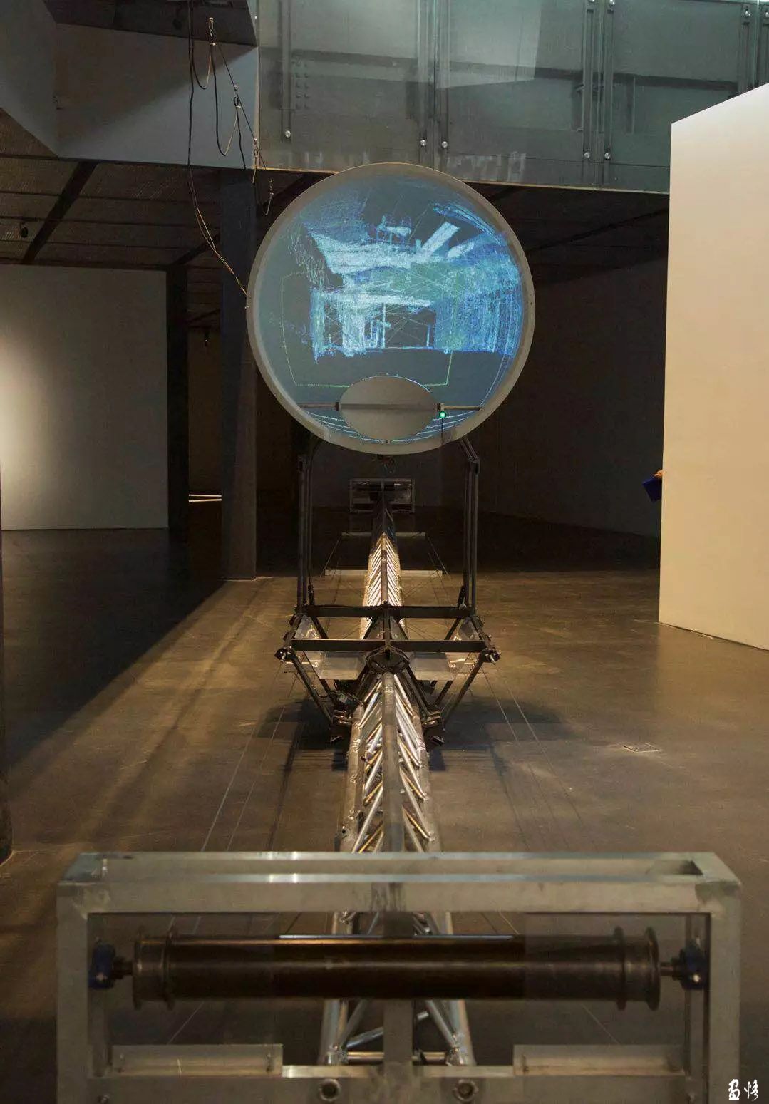 △《直線位移》, 馬尼克斯·德·尼斯 ,機械直線運動裝置,沉浸式投影,半球形屏,寬120厘米,長30米,2014
