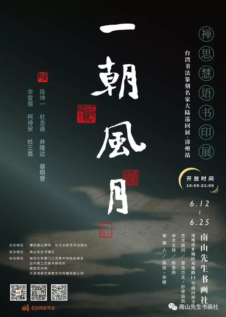 《一朝風(fēng)月·禪思慧語》的展覽是漳州南山禪寺南山先生書畫社與臺灣長歌藝術(shù)傳播公司聯(lián)手打造在中國大陸巡回展的首展。藉書印藝術(shù)以啟迪人心,為促進海峽兩岸的文化藝術(shù)與情感交流,臺灣長歌藝術(shù)傳播公司誠邀臺灣著名書法家與篆刻家陳坤一、杜忠誥、林隆達、蔡明贊、李螢儒、柯詩安、杜三鑫等人,以「禪思慧語」為主旨提供書法與篆刻作品,計劃于漳州、北京、上海、杭州、福州、廈門等地巡回展覽。