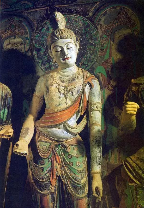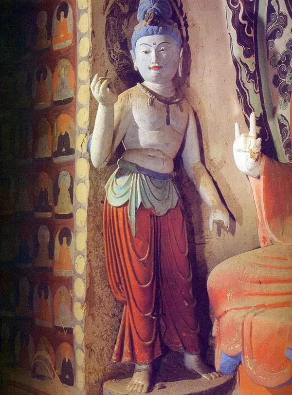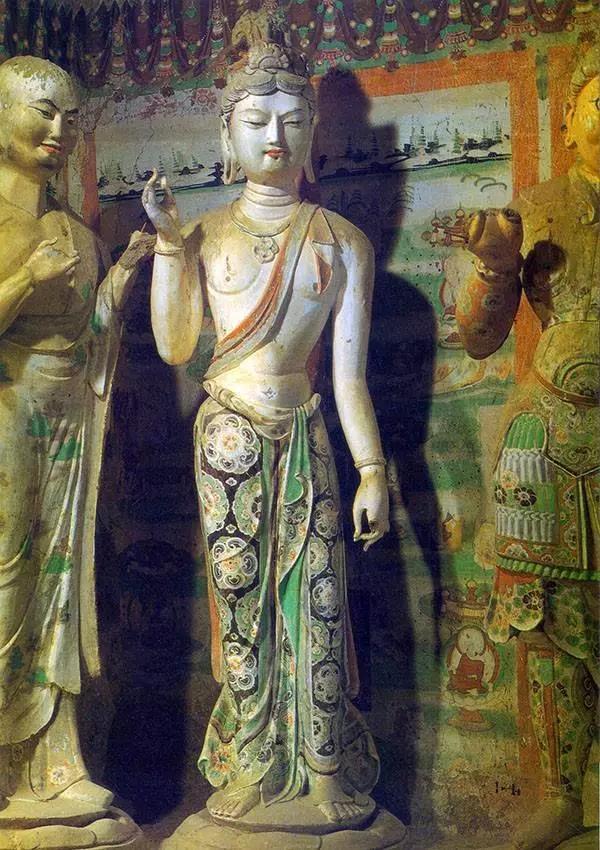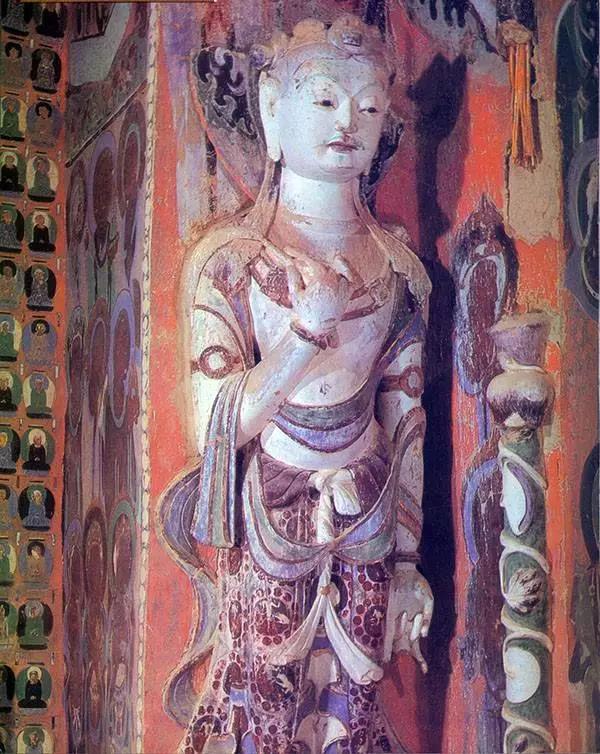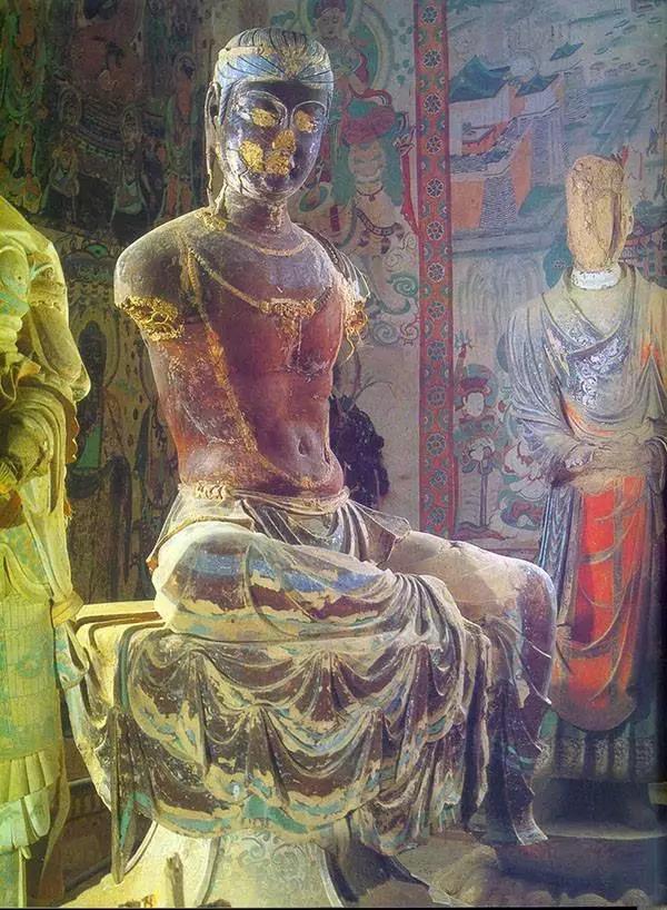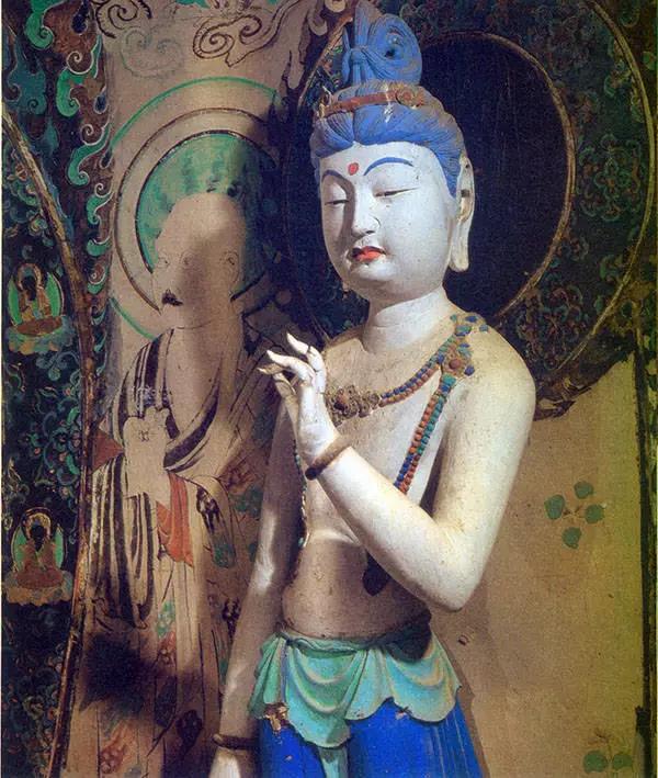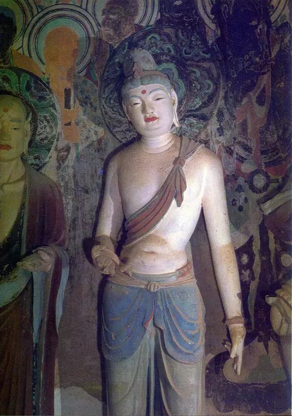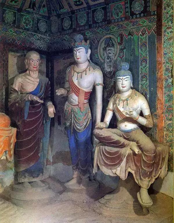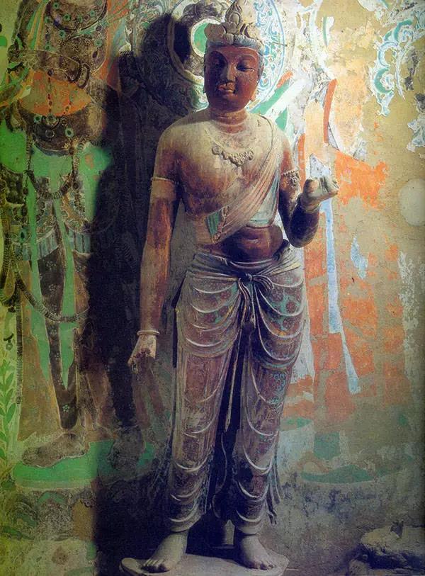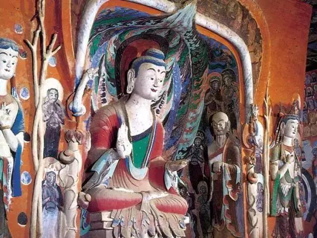 敦煌莫高窟的石窟造像主要是泥塑,因均施彩繪,故稱彩塑。顏料取之于天然礦石,色澤艷麗,顏色長(zhǎng)久不變。彩塑是洞窟的主體,一般位于正廳中間,主要塑佛像或菩薩像,四壁和頂上才是壁畫,早期的洞窟,壁畫只是作為裝飾和陪襯出現(xiàn)的。