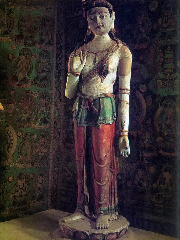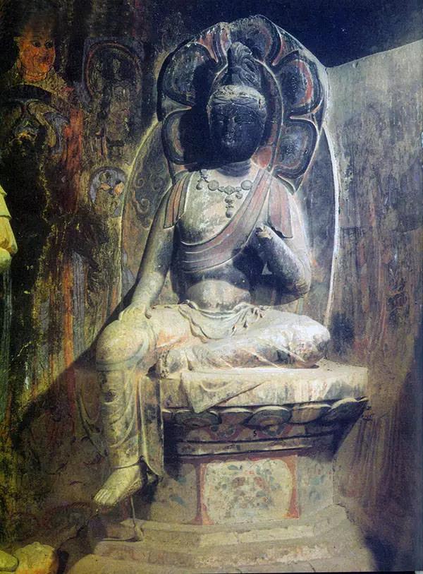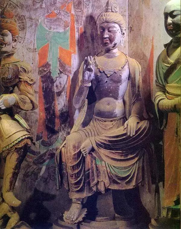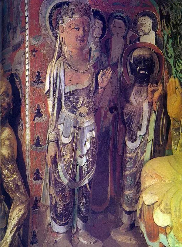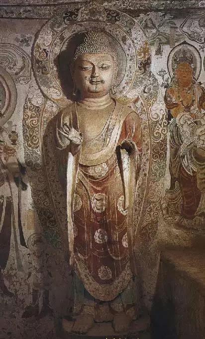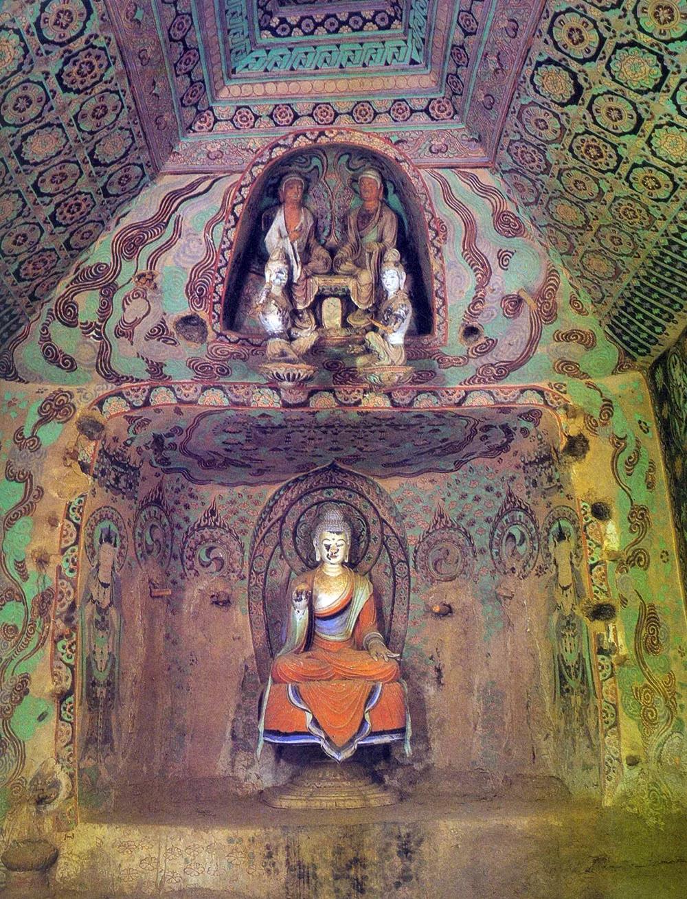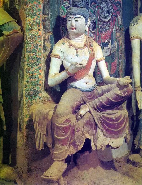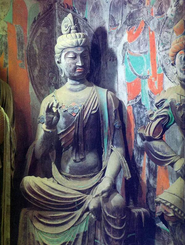 敦煌莫高窟的石窟造像主要是泥塑,因均施彩繪,故稱彩塑。顏料取之于天然礦石,色澤艷麗,顏色長(zhǎng)久不變。彩塑是洞窟的主體,一般位于正廳中間,主要塑佛像或菩薩像,四壁和頂上才是壁畫,早期的洞窟,壁畫只是作為裝飾和陪襯出現(xiàn)的。