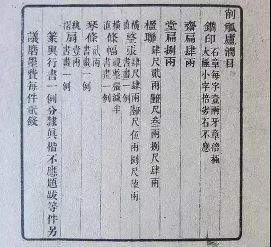 堂匾廿兩,齋匾八兩,楹聯(lián)三尺三兩、四尺四兩、五尺五兩、六尺八兩,橫直整張四尺八兩、五尺十二兩、六尺十六兩,書畫一例,條幅視整張減半,琴條四兩,書畫一例,冊(cè)頁執(zhí)摺扇每件二兩,一為度,寬則遞加,上記:每?jī)梢来笱笠辉慕?。?br>