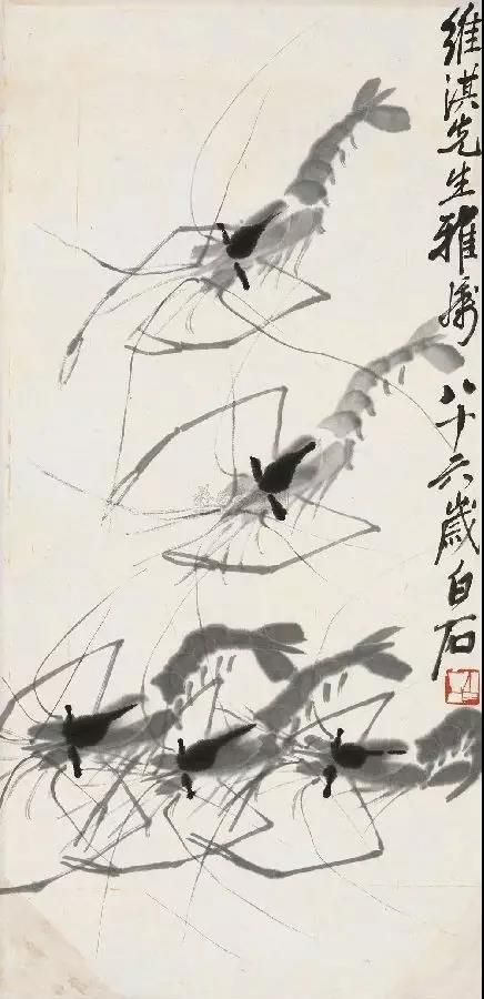 隨后,齊白石揮筆作畫。先畫了一只正在水邊嬉戲的蝦,活靈活現(xiàn);又在旁邊,畫了一只在水面上只露出上半身的蝦,下半身被層層水波擋住,惟妙惟肖。兩人皆大歡喜。