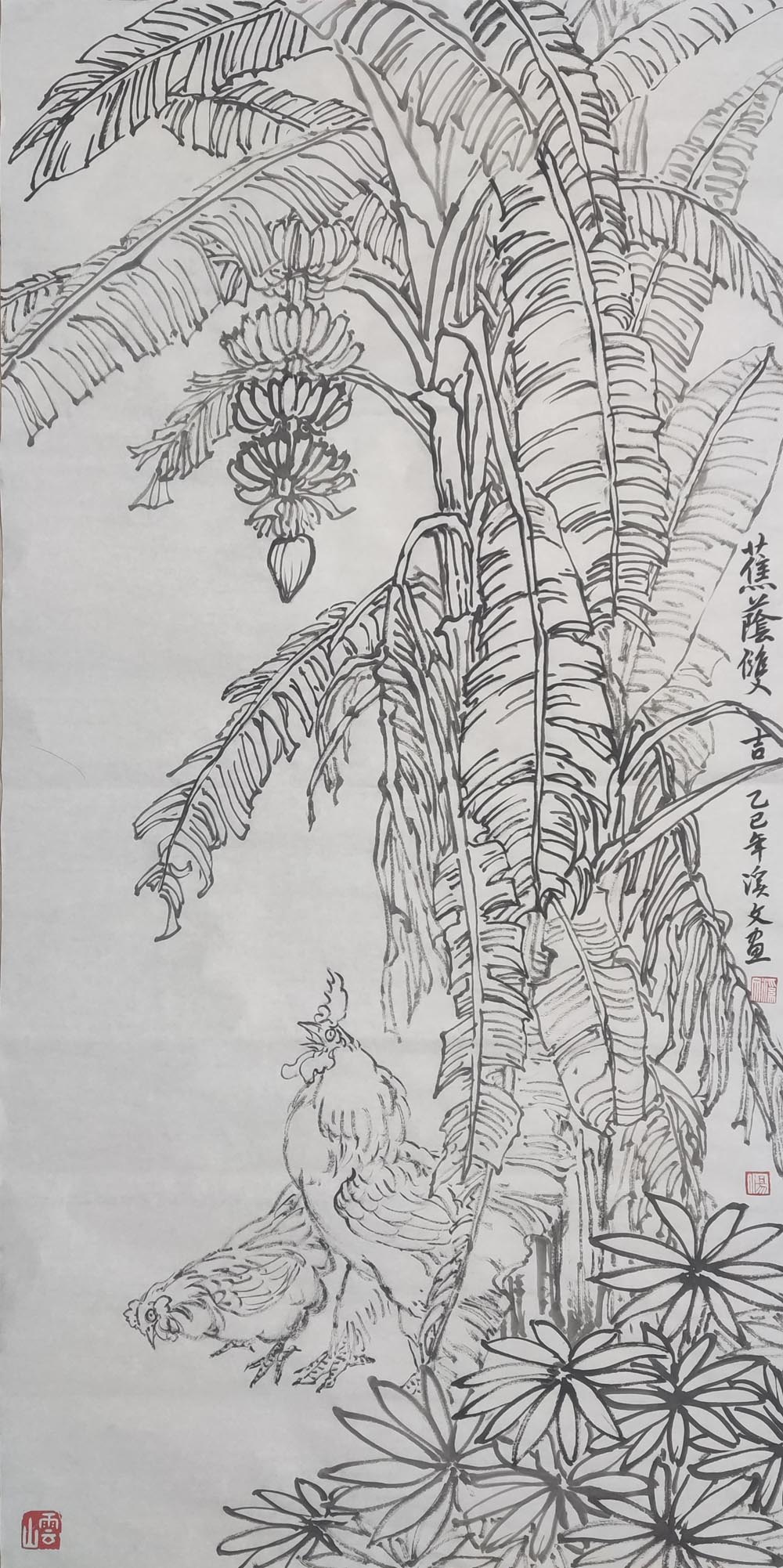 湯溪文《蕉蔭雙吉》50X100cm